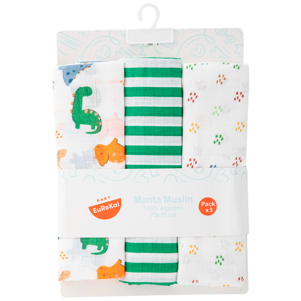Cuna Manta Muselina Colores y Dino Pack x3 BABY EUREKA