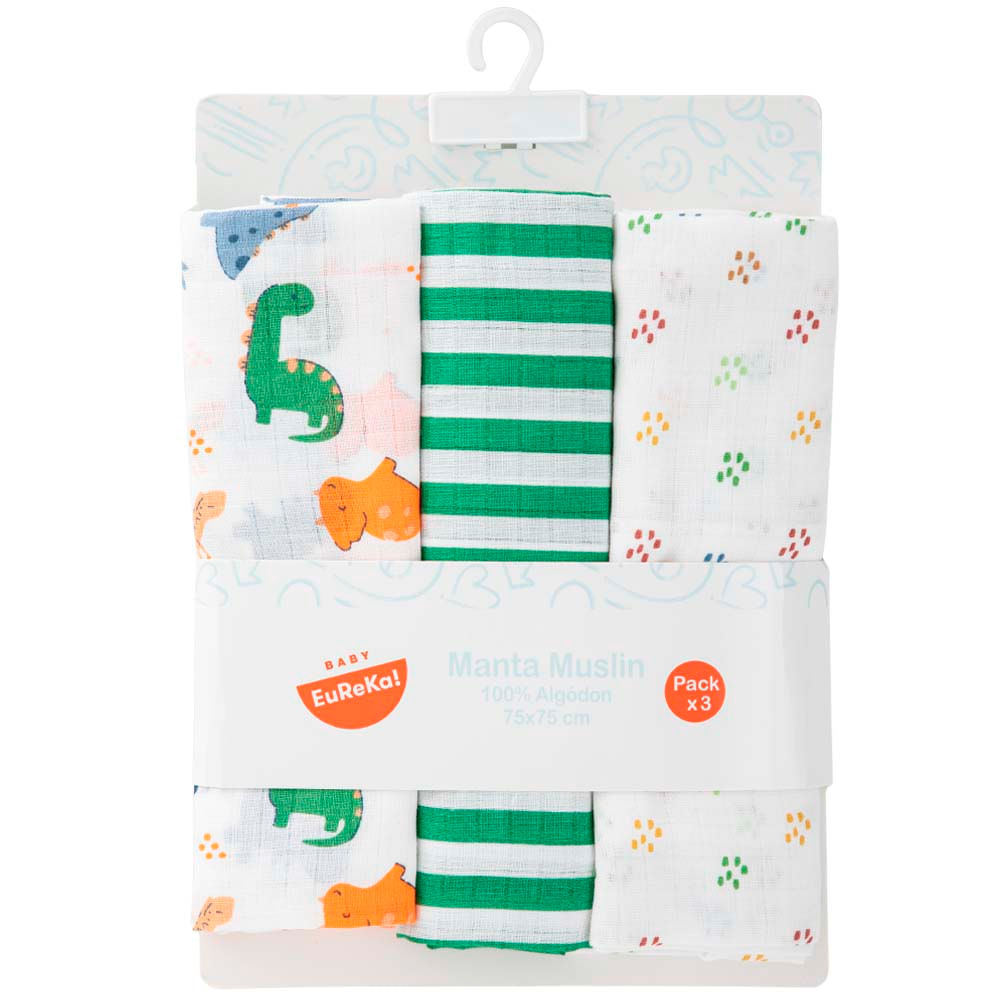 Cuna Manta Muselina Colores y Dino Pack x3 BABY EUREKA