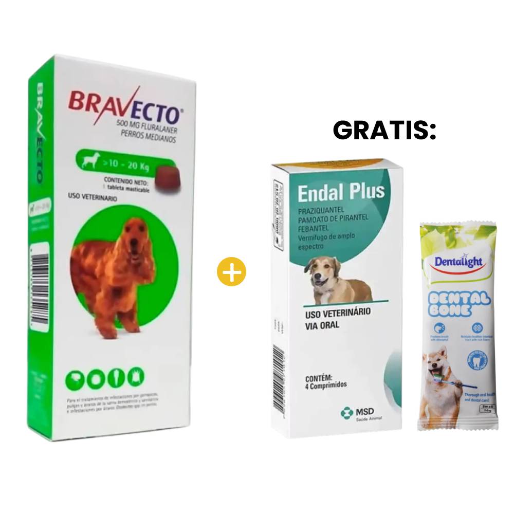 Bravecto Antipulgas Perro Masticable 10 a 20 Kg y GRATIS Endal Antiparasitario x4 und y Dental Bone