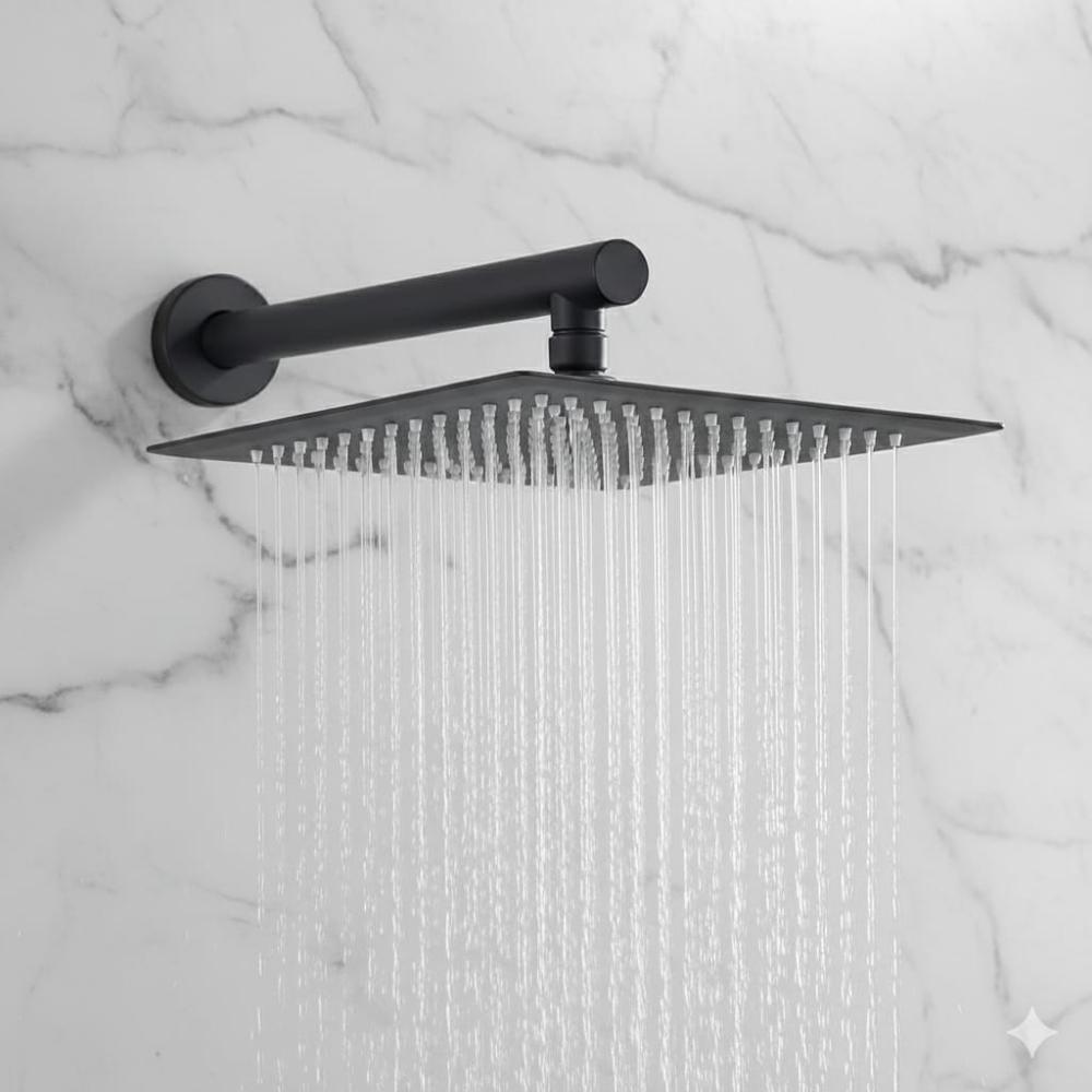 Cabezal Ducha Acero SS201 Negro Mate Cuadrado ultra plano 15x15cm con brazo de 30cm Recto Redondo