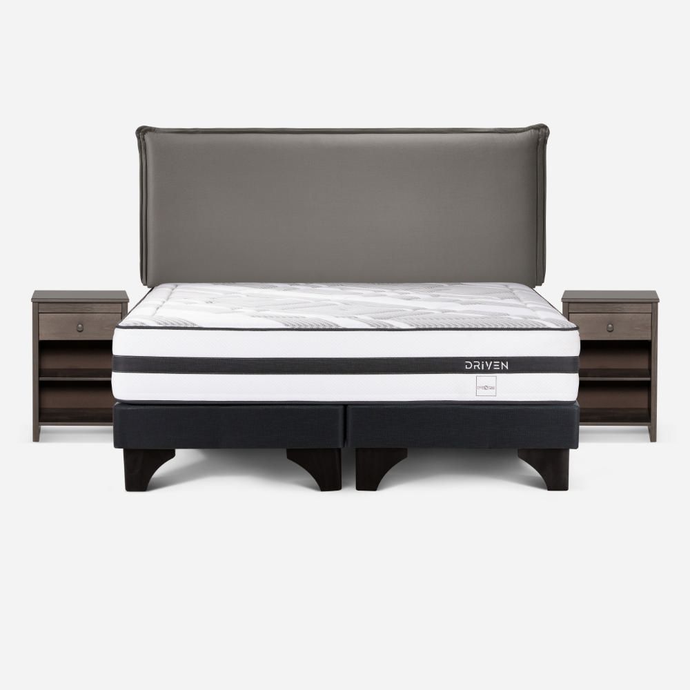Dormitorio Europeo Driven Queen + Respaldo Maurice Gris + 2 Veladores Ferrara Gris