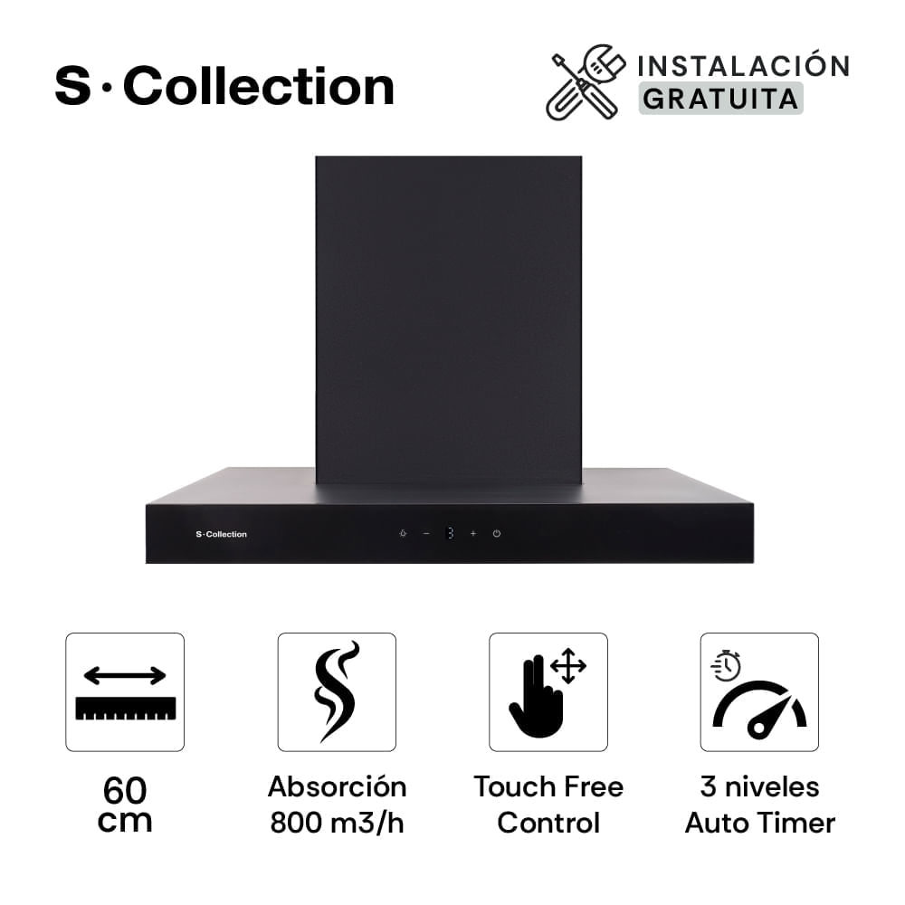 | Características | Panel de control digital Touch y Display. Auto timer “After Cooking” de 3 min. Ducto decorativo telescópico Black Style. Sistemas de seguridad: Salva motor térmico (protege a campana en caso de sobrecalentamiento) y conexión a tierra (contra fugas de corriente). Iluminación LED Cool White (bajo consumo, mayor ahorro). |
