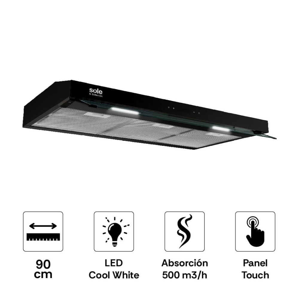 | Características | Panel de control digital touch y display. 2 motores. Auto timer programable de 1 a 15 min. Visera regulable que mejora el área de absorción. Sistemas de seguridad: Salva motor térmico (protege a campana en caso de sobrecalentamiento). Iluminación LED Cool White (bajo consumo, mayor ahorro). Nivel de ruido: 65 dB (A). |