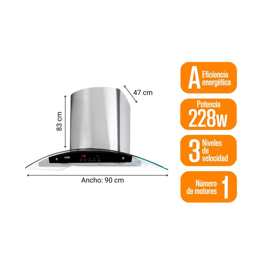 | Características | Campana decorativa de cuerpo hecho en acero inoxidable con laterales y visera de vidrio templado de 5mm de espesor. Cuenta con panel análogo para control de luz (Encendido y apagado) y control de 3 velocidades (vapores, guisos y frituras), 1 motor de 228 W, 2 filtros de aluminio para grasas y 1 filtro de carbón para olores, salvamotor térmico incorporado, 2 focos de 1 Watt c/u ubicados en la parte frontal-inferior del producto. Capacidad de absorción velocidad 1: 420 m3/h, velocidad 2: 520 m3/h, velocidad 3: 700 m3/h. Voltaje: 220 V - 60 Hz. Diámetro de salida al ducto: 15 a 16 cm. Sensor detector de humos y timer de hasta 99 minutos. |