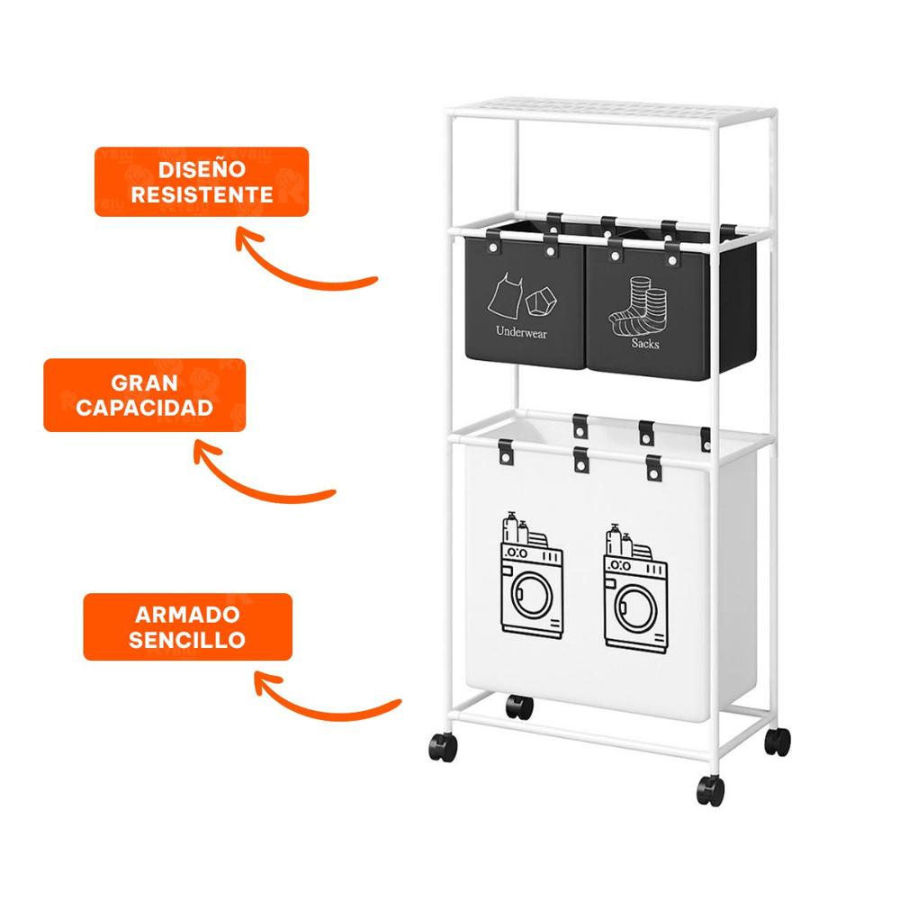 Carro Ropa Sucia 3 Niveles Sistema Organizador con 3 Cestos Blanco Negro Y+Ligas Regalo