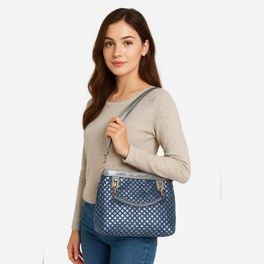 Cartera Dama Elegante Azul-Plata Moderna, Espaciosa Versátil