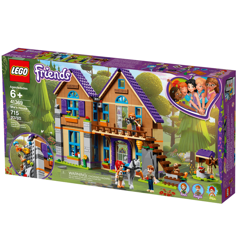 | Características | • Incluye 3 minipersonajes: LEGO® Friends Mia, su mamá, Ann, y su papá, Angus; incluye también 2 figuras de animales: un conejo y una yegua. | • Cuenta con una casa estilo cabaña rural de 2 pisos que incluye la habitación de Mia, la sala de estar, el baño con lavabo e inodoro, y una cocina. También tiene una pared de escalada con una entrada oculta a la habitación de Mia y un pozo en el exterior con una cubeta. | • La habitación de Mia cuenta con una litera, una lámpara, un escritorio y una silla. | • La cocina cuenta con un horno, una placa con quemadores y una zona de comedor. | • Accesorios incluidos: batidora, espátula, recipiente, barra de pan, sartén, huevo frito, plato, cubiertos, 3 tazas, 3 recipientes para cupcakes y una bandeja de hornear, montura, brida, casco, patines, panal, teléfono celular y cámara. | • Interpreta la vida en familia con mamá y papá en esta casa rural de juguete. | • Cuida de la yegua Metzie y dale de comer al conejo en el área de preparación exterior. | • Quita el piso de la habitación de Mia para acceder fácilmente a toda la cocina y ayuda a mamá y papá a preparar la comida. | • Ayuda a Mia a practicar su afición por la fotografía de la flora y fauna con la cámara. | • Trepa por la pared de escalada hasta la habitación de Mia cuando llegue la hora de irse a dormir. | • Los sets LEGO® Friends fomentan el juego creativo y convierten la construcción en una actividad imaginativa y divertida. | • Mide más de 22 cm de altura, 31 cm de ancho y 9 cm de profundidad. |