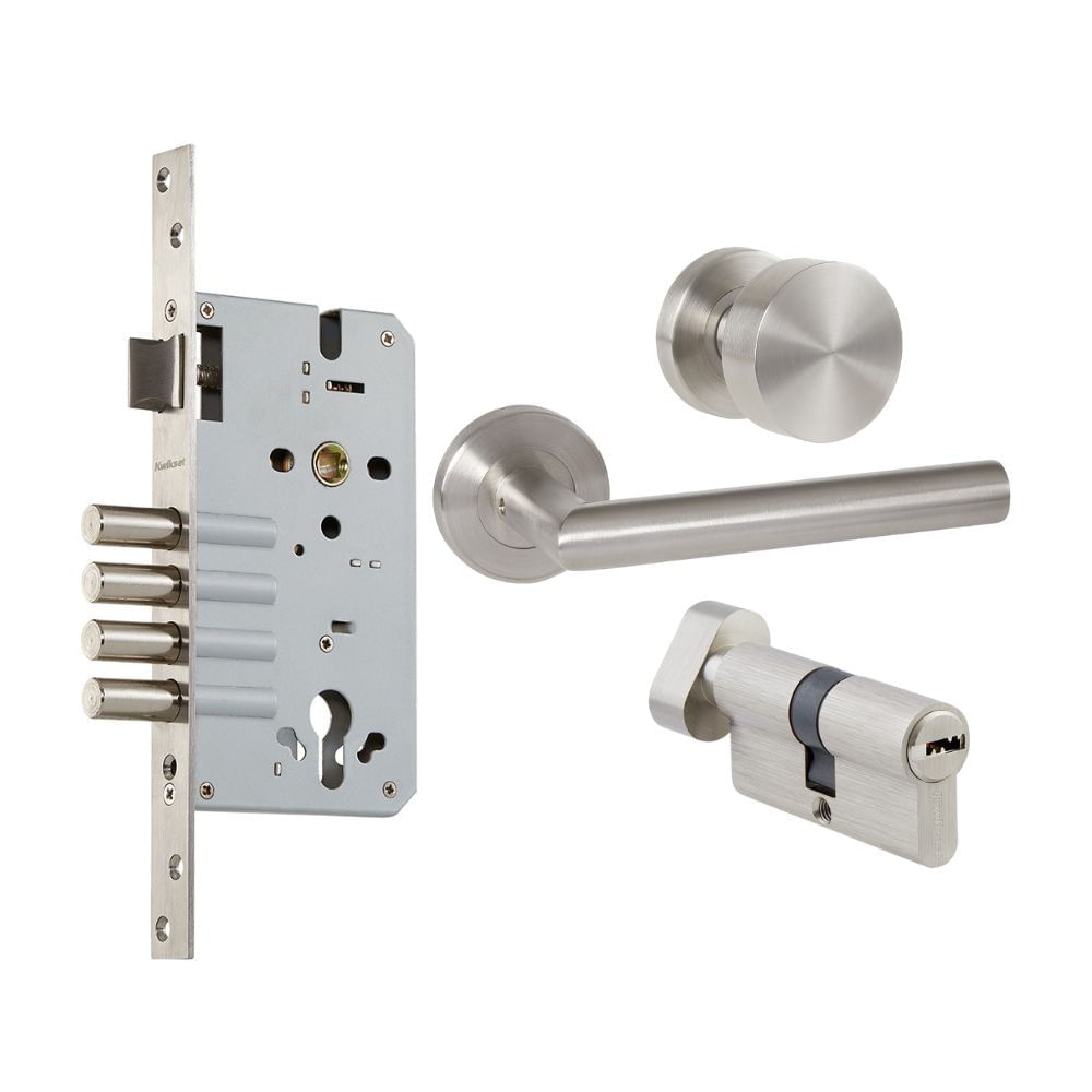 | Características | Cerradura de embutir con 3 o 4 pivotes de acero. Bulones/Pivotes de doble o triple avance. Cilindro multipunto de perfil europeo anti taladro. Manija/Pomo para el exterior y jalador en el interior. Estilo contemporáneo con perfil plano. Apertura: Derecha / Izquierda. Pestillo reversible. Cilindro con llave incluye 5 llaves multipunto. Garantía de por vida en mecanismo y acabado. |