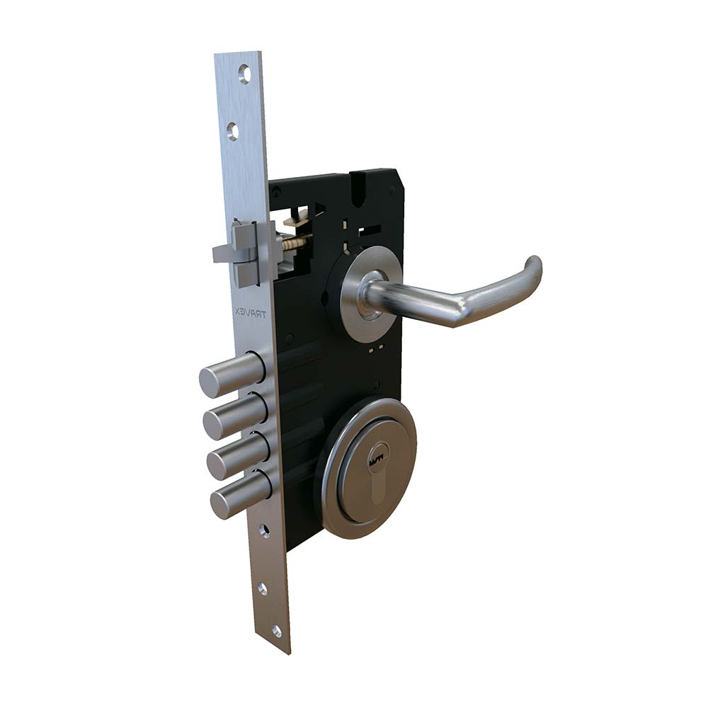 | Características | Sistema llave-llave. Pestillo contra tarjeta. Pomo fijo exterior con manija móvil interior. Mecanismo de cierre: 4 pivotes, 1 picaporte. Los pivotes son accionados con la llave para abrir o cerrar externa e internamente. El picaporte es accionado con las manijas. |