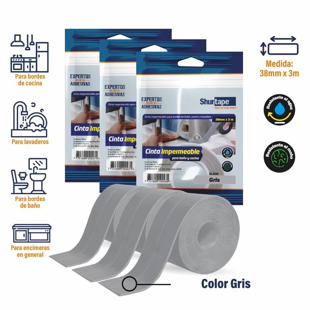 Cinta Impermeable Gris Pack x3 und - para baño y cocina 38mm x 3m
