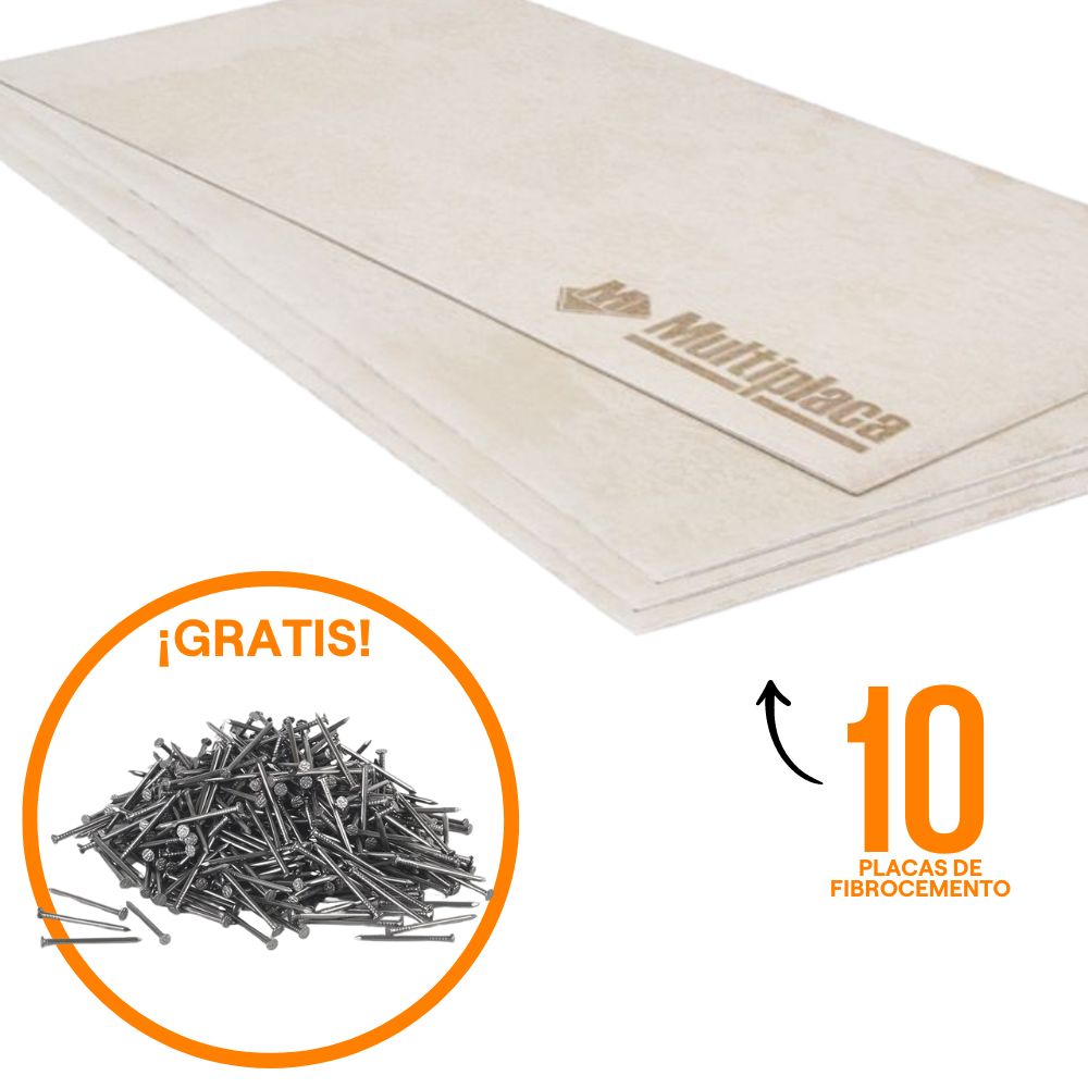 COMBO: 10 Placas Fibrocemento Multiplaca 4 mm 1.22x2.44 metros Mutiplaca + Clavo con cabeza 1"x16 - 250 gramos Prodac