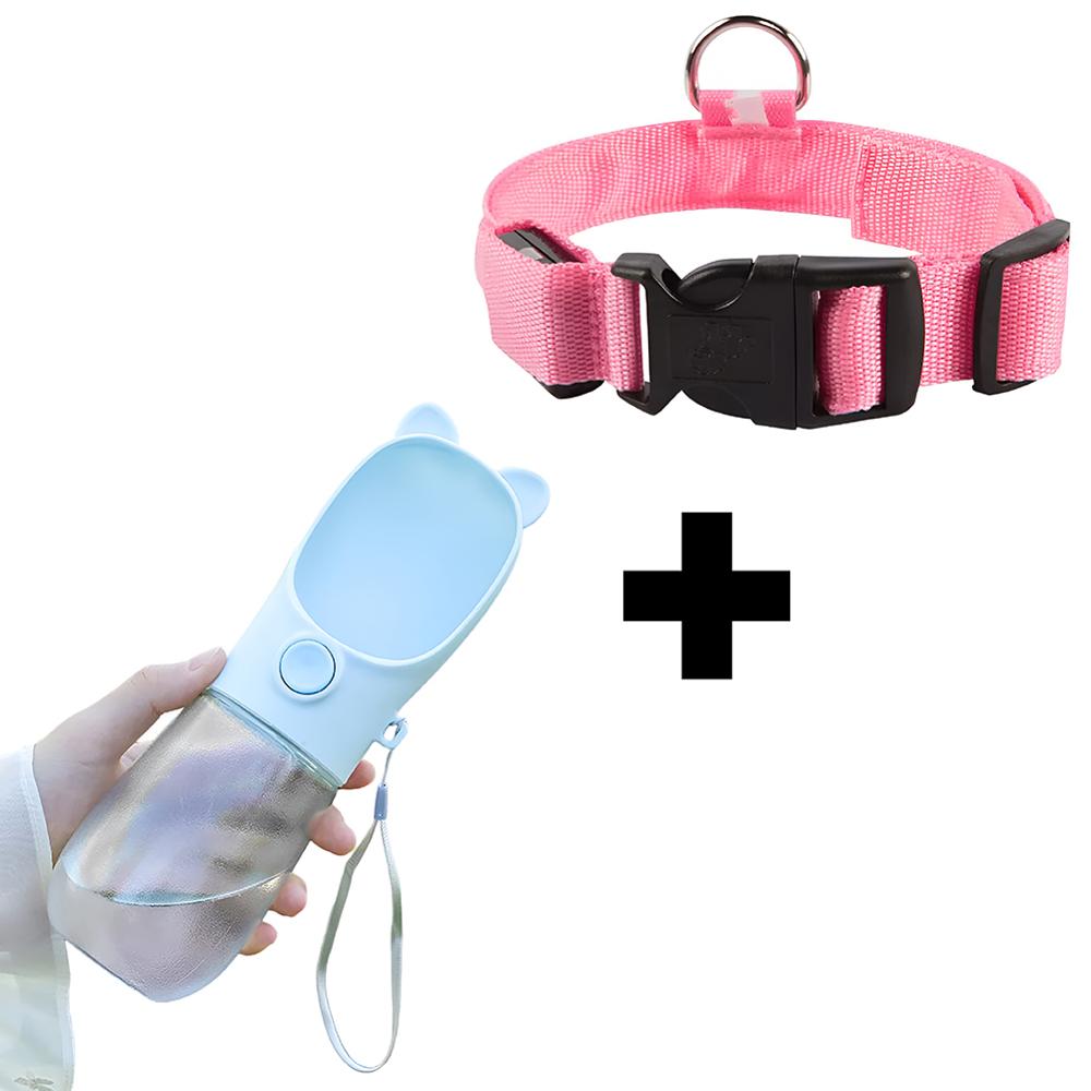 Combo bebedero dispensador de agua azul + correa para perro rosado