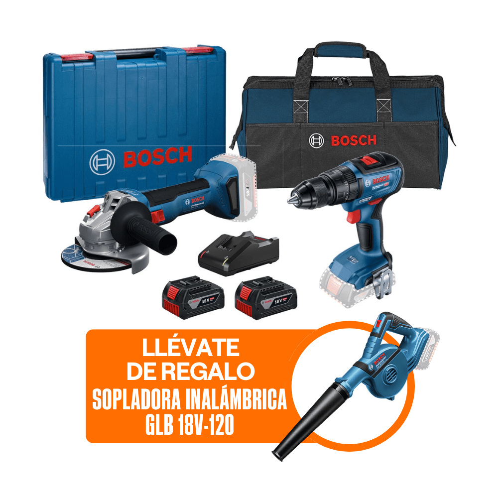COMBO Bosch Inalámbrico: Amoladora GWS18V-8 + Taladro Percutor GSB18V-50 + 2 baterías 4AH + Cargador + Maletín + Bolso de Lona + Sopladora GBL 18V-120