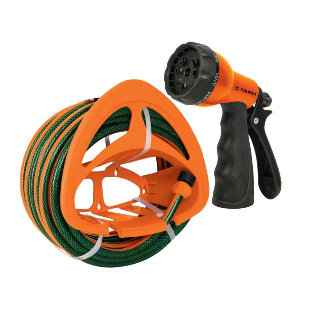 Combo Manguera de Riego 1/2" 10 Metros más Pistola de Riego 8 funciones y Portamanguera Truper