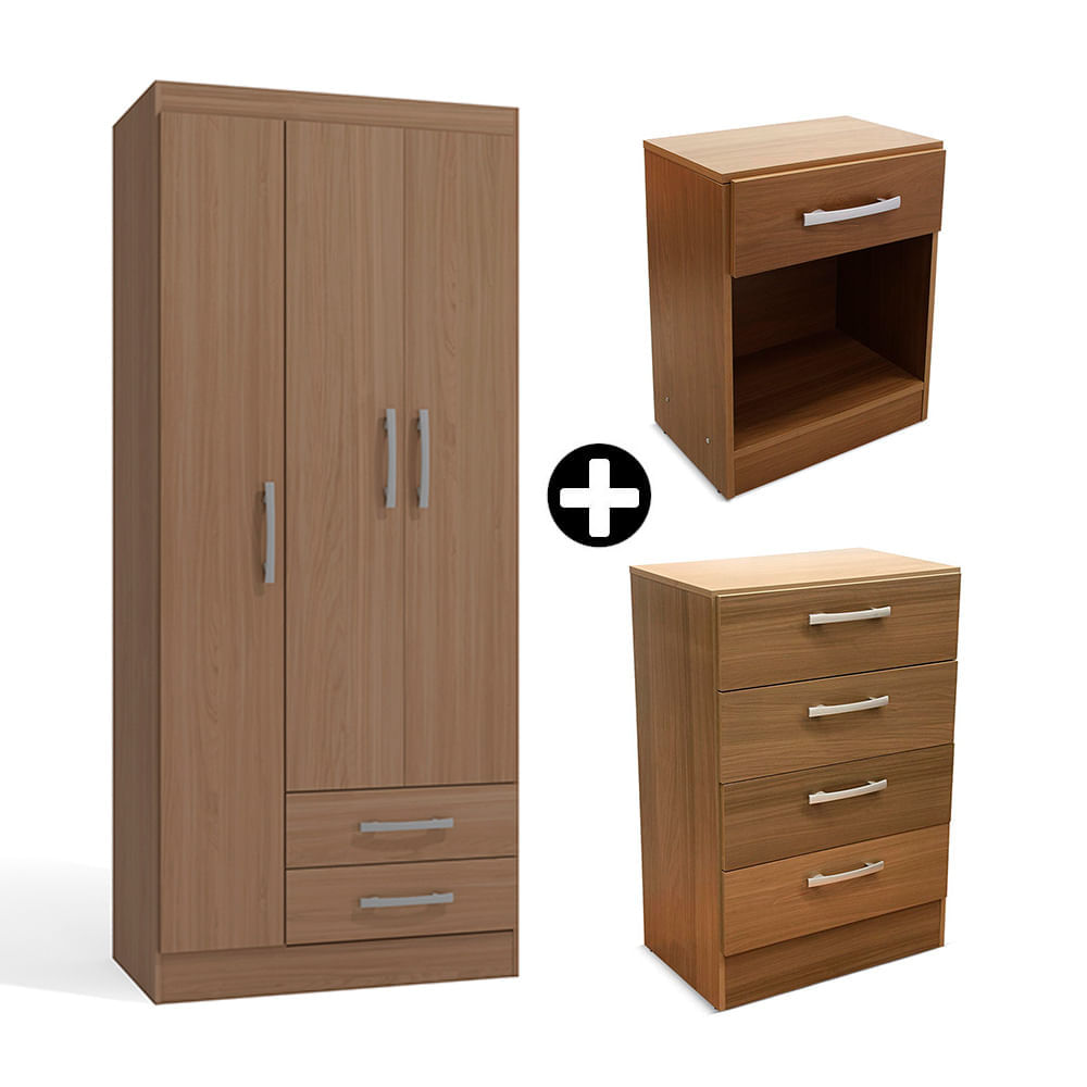 COMBO Ropero Cali 3 puertas Nature + Cómoda Cali 4 cajones Nature + Velador Cali 1 cajón Orange