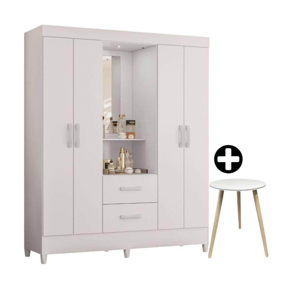 COMBO Ropero Mobi Tocador con Luz 4 Puertas 2 Cajones Blanco Albatroz + Mesa Auxiliar Redonda MDF Neón Orange