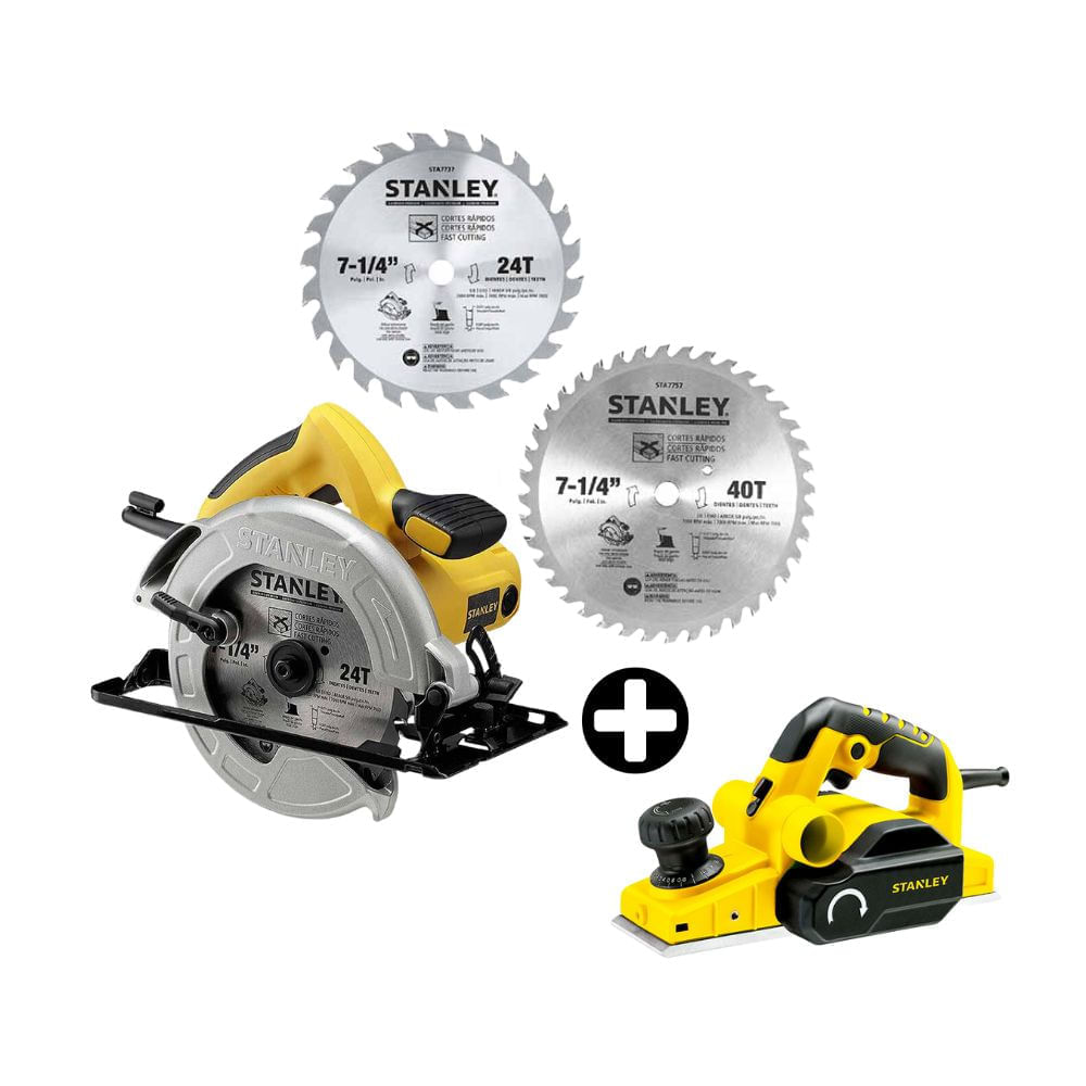 COMBO Stanley: Sierra Circular SC16 1600W + 2 Discos 7-1/4" + Cepillo de Madera 750W STPP7502