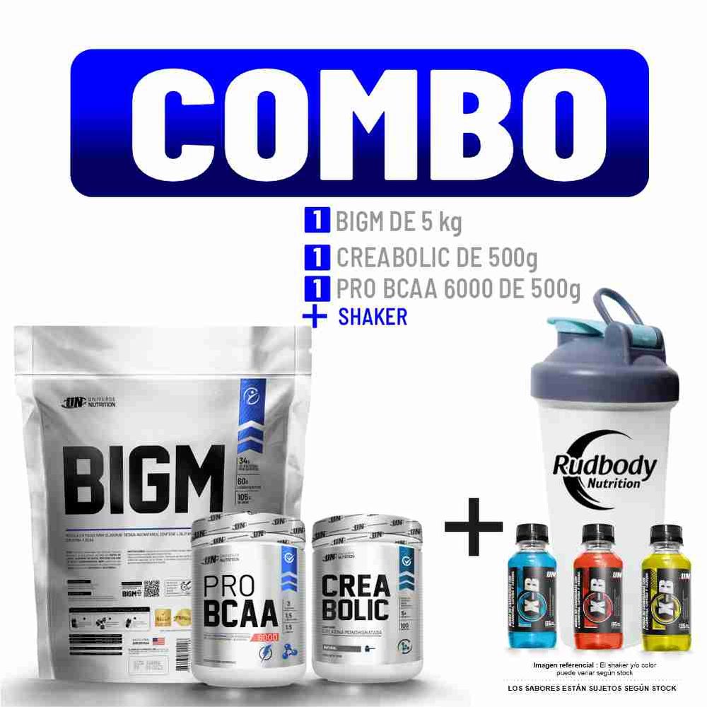Combo UN - Bigm 5000gr Chocolate + Creabolic 500gr + Pro Bcaa 6000 500gr Manzana + Shaker