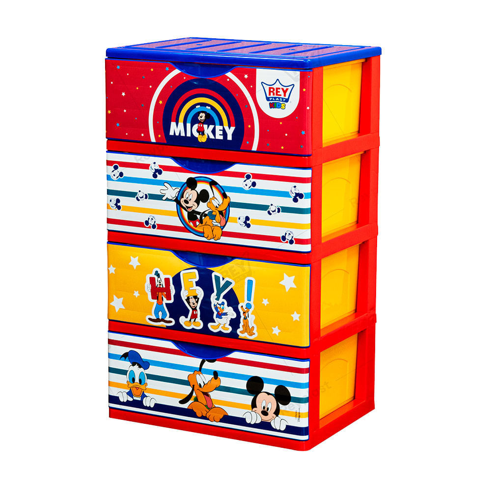 | Características | De 4 cajones frontales. Decorado Mickey de fondo reforzado y tapa plana. Cada cajón cuenta con un tope en el borde de la parte trasera para evitar que el cajón no salga por completo de la cómoda evitando su caída. Sus esquinas son redondeadas, evitan la acumulación de suciedad y facilita limpieza. Sus dimensiones son adecuadas para organizar y guardar prendas de vestir. |