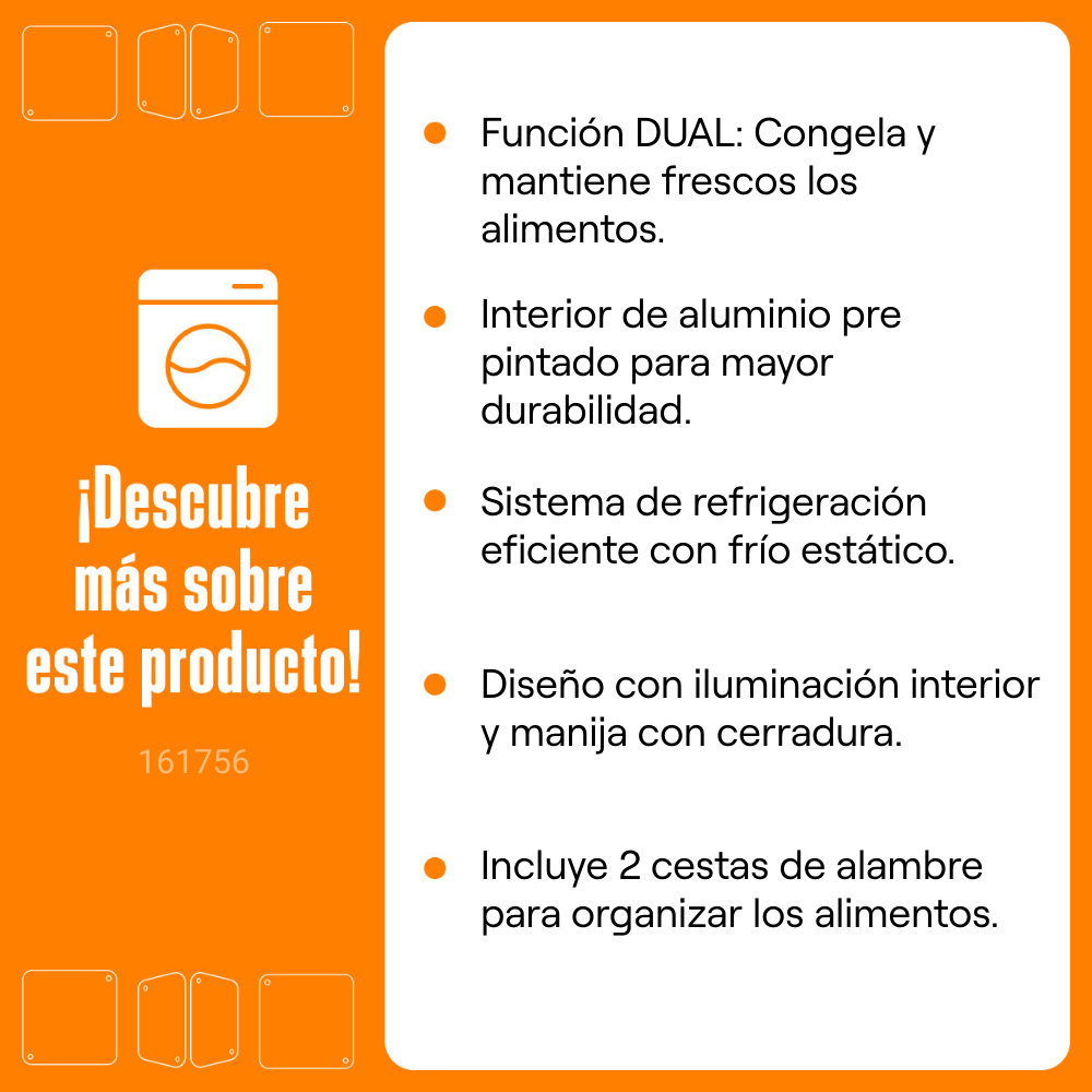 | Características | unción DUAL: Congela y mantiene frescos los alimentos.Interior de aluminio pre pintado.Sistema de refrigeración con frío estático.Sistema ajustable de temperatura interior por termostato.Doble puerta de tapa dura.Condensador interior + rollo con motor ventilador compresor.Temperatura de trabajo de -18°C a 10°C.Iluminación interior en las dos puertas.Revestimiento de aluminio lacado en blanco.Manija y cerradura.Con rueda unilateral estándar de 4 piezas.2 cestas de alambre.Condensador ubicado en la parte posterior para mayor eficiencia de enfriamiento. |
