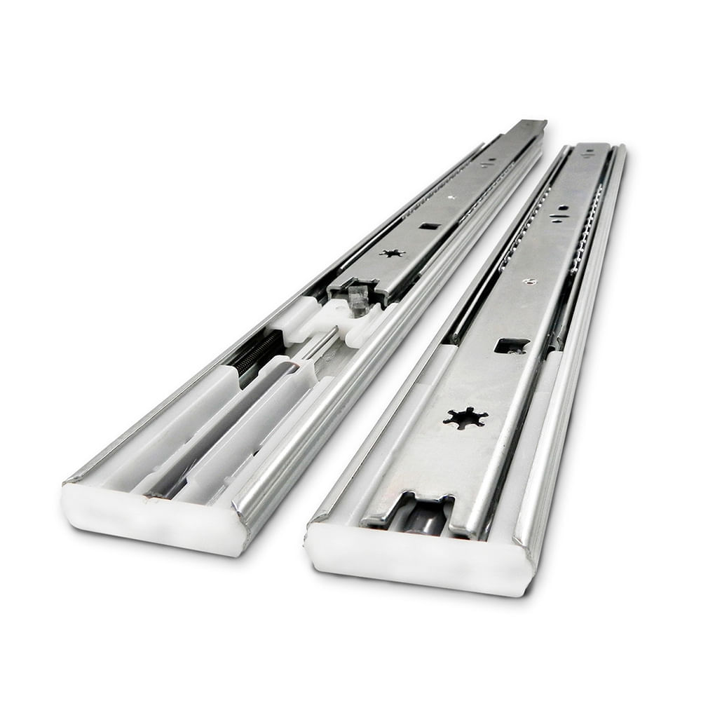 | Características | Rieles de acero galvanizado, cuenta con villas de acero que le permite un desplazamiento del cajón con más suavidad, cuenta con un sistema de cierre lento que amortiguan al momento de cerrar el cajón, protegerá al mueble, también permite una apertura total del cajón. |