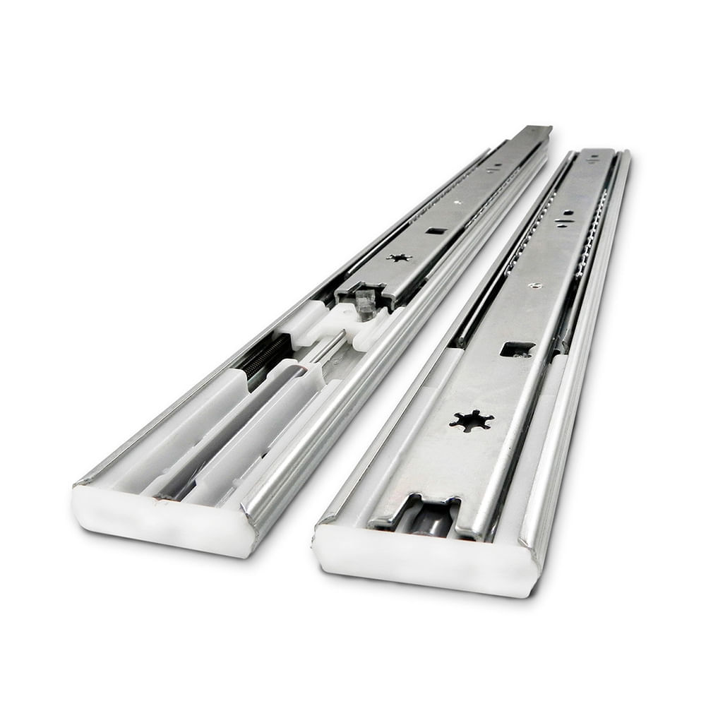 | Características | Rieles de acero galvanizado, cuenta con villas de acero que le permite un desplazamiento del cajón con más suavidad, cuenta con un sistema de cierre lento que amortiguan al momento de cerrar el cajón, protegerá al mueble, también permite una apertura total del cajón. |
