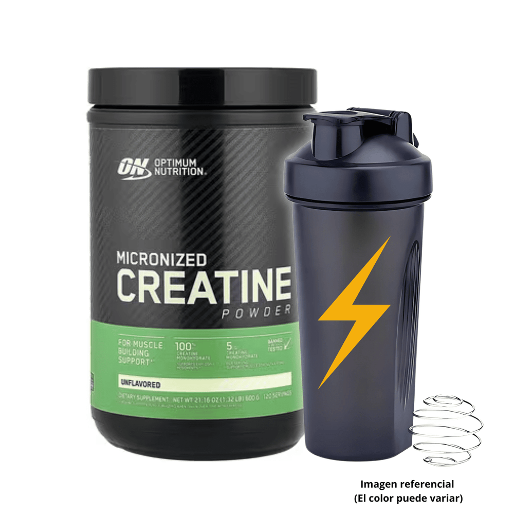 CREATINA OPTIMUM NUTRITION DE 600gr CON CUCHARA MEDIDORA Y SHAKER Negro