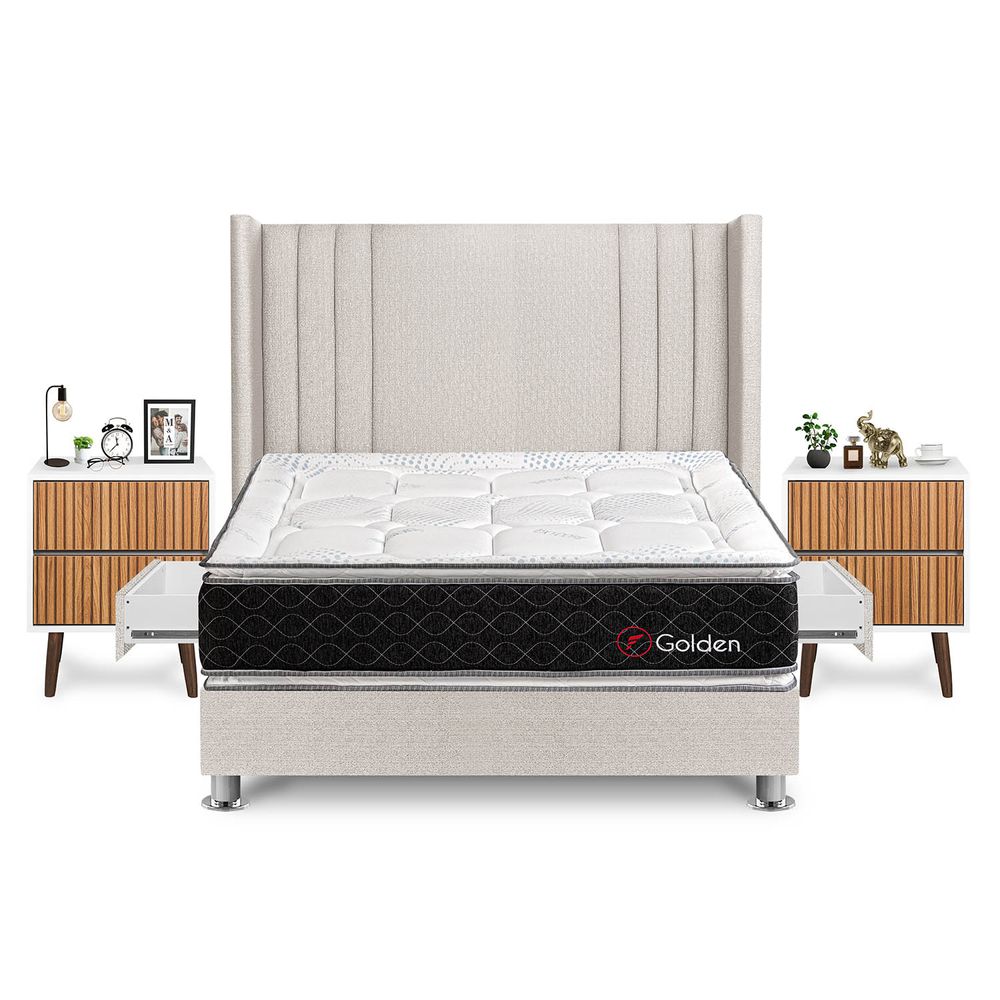 Dormitorio Golden Con 4 Cajones Queen + Velador Milan + Respaldo Beige