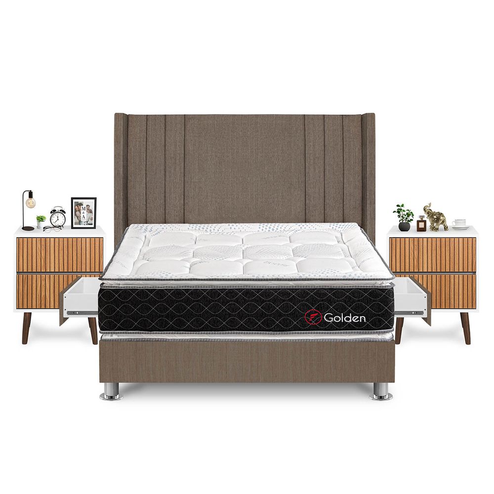 Dormitorio Golden Con 4 Cajones Queen + Velador Milan + Respaldo Marron