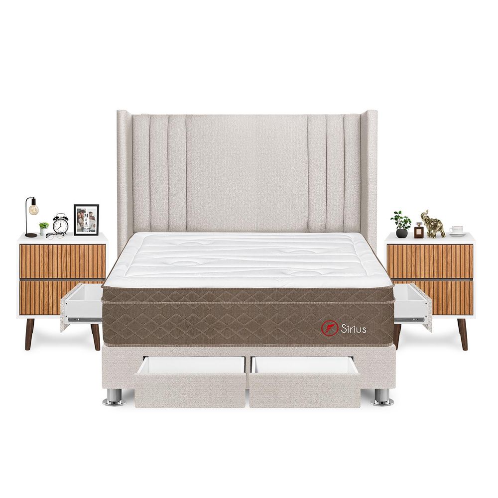 Dormitorio Sirius Con 4 Cajones Queen + Velador Milan + Respaldo Beige
