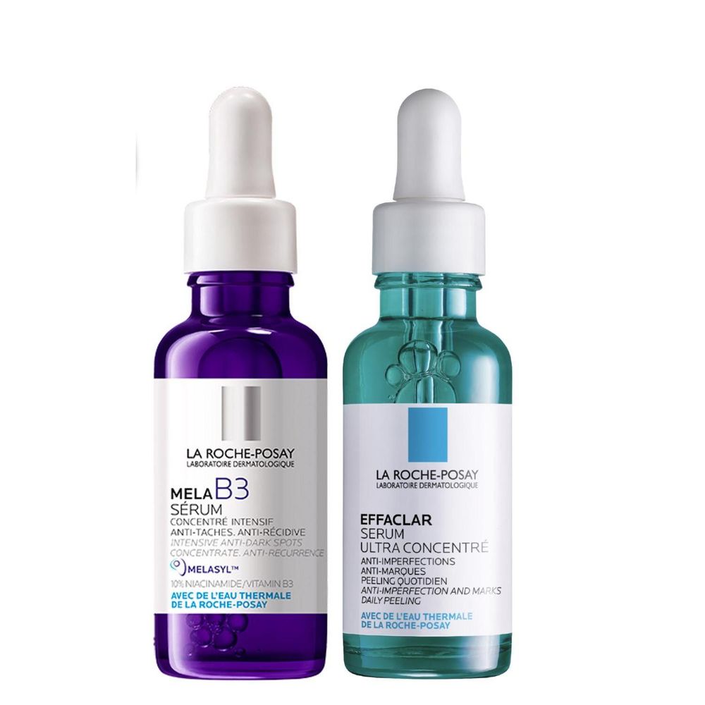 | Beneficios | Serum Mela B3: Este serum ayuda a reducir las manchas, y a igualar el tono de la piel. Cuenta INNOVACIÓN ANTI-MANCHAS DE LA ROCHE-POSAY: MELASYL, MOLÉCULA MULTI-PATENTADA. EL NUEVO ACTIVO PARA COMBATIR LAS MANCHAS COMO NUNCA ANTES. Además, cuenta con un 10% de Niacinamida, una forma de vitamina B3. Serum effaclar: Serum concentrado que combina un complejo triácido exfoliante (Ácido glicólico + Ácido Salicílico + LHA) con Niacinamida, para una acción anti-imperfecciones, poros visibles y puntos negros. Una fórmula que purifica la piel, alisa la textura y reduce finas líneas. |