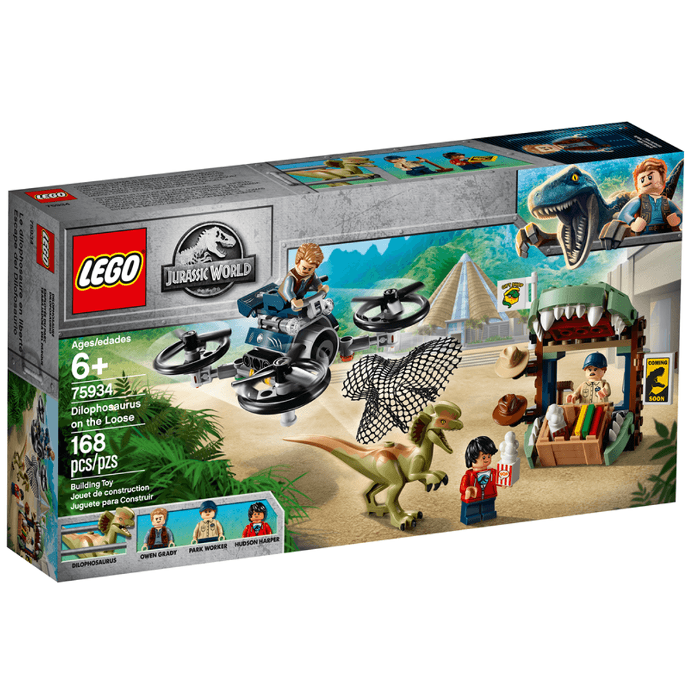 | Características | • Este set de juguetes de dinosaurios LEGO® Jurassic World incluye 3 minifiguras: Owen Grady, Hudson Harper y un trabajador del parque; incluye también una figura de un Dilofosaurio de juguete (novedad en junio de 2019). | • El dron helicóptero de juguete está equipado con una cabina para una minifigura, 4 rotores giratorios y un cañón lanzarredes. | • El puesto con forma de cabeza de dinosaurio cuenta con un contenedor para exhibir los artículos a la venta, 4 calcomanías a modo de pósters, una bandera y otros accesorios, como una pala, una escoba, una red, 2 sombreros y 2 cajas de palomitas. | • La figura del Dilofosaurio tiene mandíbulas articuladas. | • Las minifiguras de Hudson Harper y el trabajador del parque son novedad en junio de 2019. | • Con este juguete coleccionable, tu peque puede reimaginar las emocionantes escenas de la serie de animación LEGO® Jurassic World. | • Este set de construcción de juguetes LEGO® es un fantástico y dinosáurico regalo para niños. | • El dron helicóptero de juguete mide más de 4 cm de altura, 11 cm de longitud y 11 cm de ancho. | • El puesto mide más de 9 cm de altura, 10 cm de ancho y 6 cm de profundidad. |