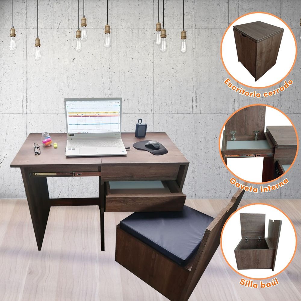 Escritorio Ahorra Espacio Plegable 3 en 1: Mesa + Baúl + Asiento FlexiDesk Bendito Mueble Marrón