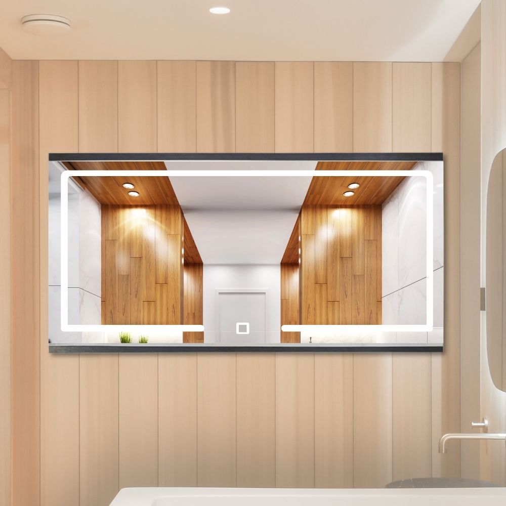 | Características | De 3 mm de espesor que cuenta con iluminación LED exactamente en el marco decorativo pavonado que se encuentra en el interior del espejo. Viene con un sensor Touch de encendido y/o apagado en la parte central inferior del espejo, además cuenta con un marco de melamine Wengue y en la parte trasera posee un soporte galvanizado para colgar el producto en la pared. |
