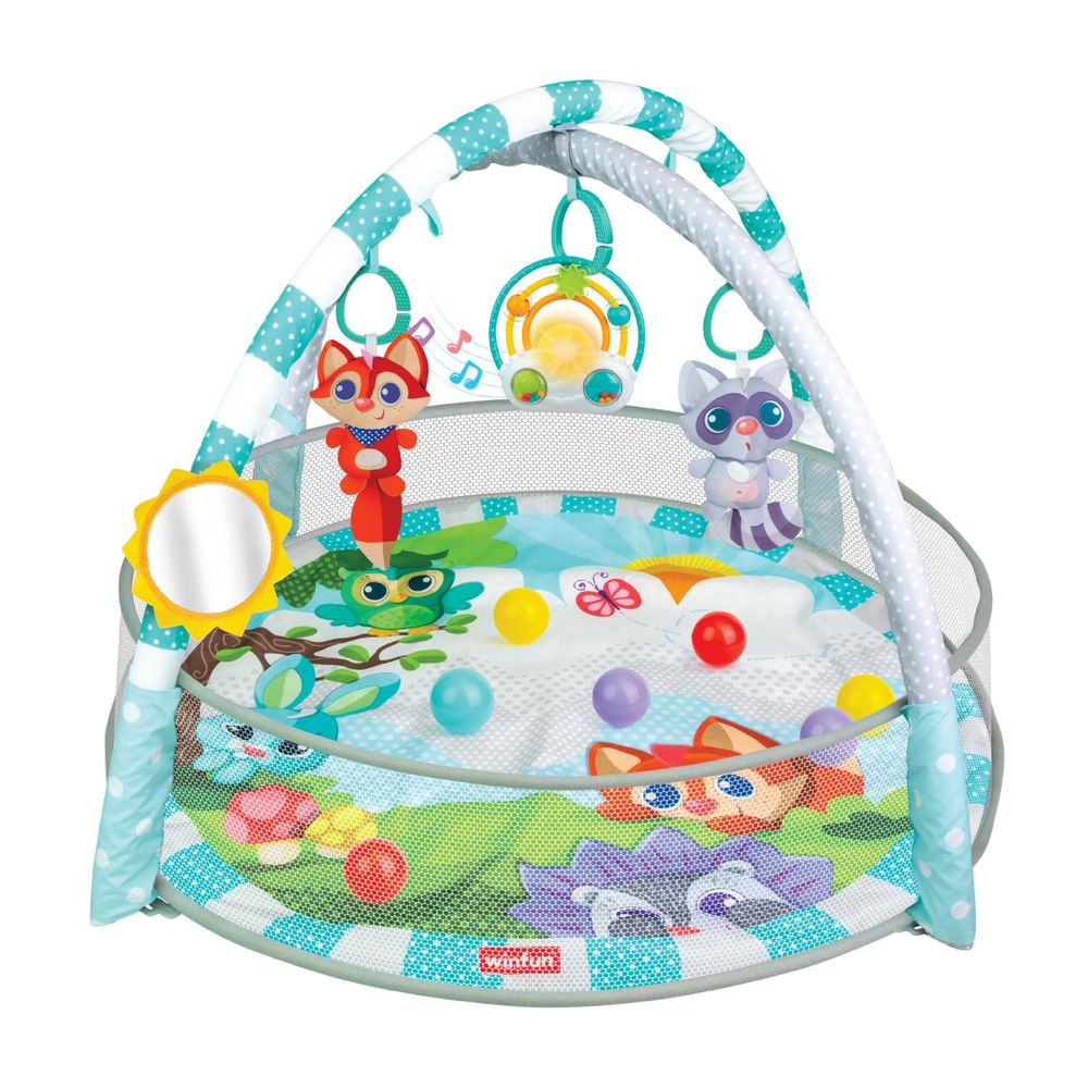 | Observaciones | • Diversión por etapas: acostarse, tiempo boca abajo y sentado • Adorables juguetes colgantes que estimulan el alcance • Incluye animales del bosque, espejo seguro y sonajero musical con luces • Se convierte fácilmente de gimnasio de actividades a piscina de pelotas • Espacio de juego de 79 cm con 15 pelotas suaves para jugar • Juguetes colgantes desmontables para usarlos en otro lugar o llevar |