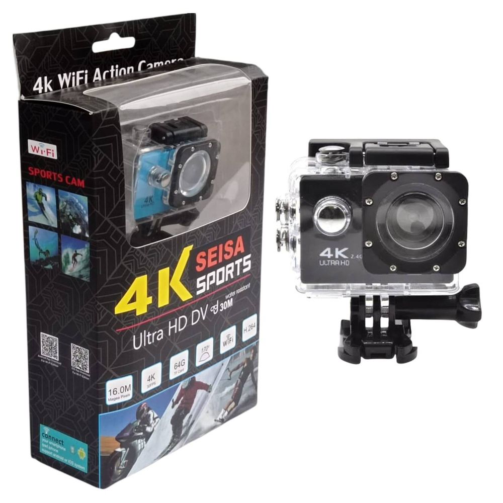 | Características | 'Cámara Ultra HD 4K. Resolución videos 4k: 3264 x 1836 píxeles / 30 fps Resolución imágenes 12mp: 4632 x 3024 pixeles. Resistente hasta 30m bajo el agua. Almacenamiento: Tarjeta micro SD. Batería: 900 mAh (2 horas). Tamaño: 5.9 x 3 x 4.1 cm. Ángulo: 170°. Puerto: Micro USB. Pantalla: 2'' full color LCD. Conexión wifi. Viene con accesorios para protegerlo y colocarlo a múltiples superficies SOPORTA MEMORIA HASTA 32 GB' |