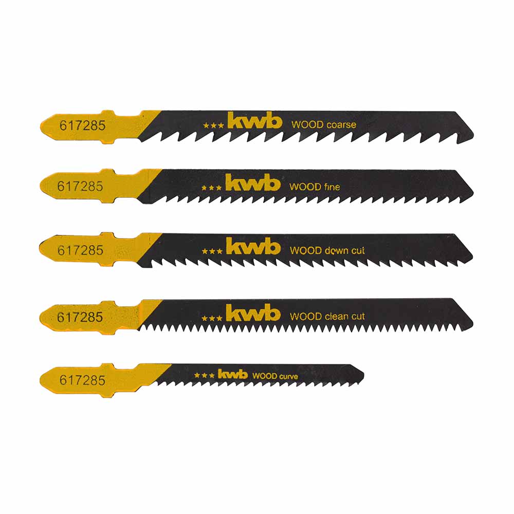| Características | Una para cortes curvos y una para cortes desde abajo (Down Cut). El corte desde abajo (Down Cut) tiene un dentado especial que permite alcanzar una velocidad de corte mucho mayor. El corte desde abajo (Down Cut) garantiza un corte preciso en el punto a cortar. Las cuchillas de este juego de KWB están hechas de acero HCS y tienen una inserción en forma de T. |
