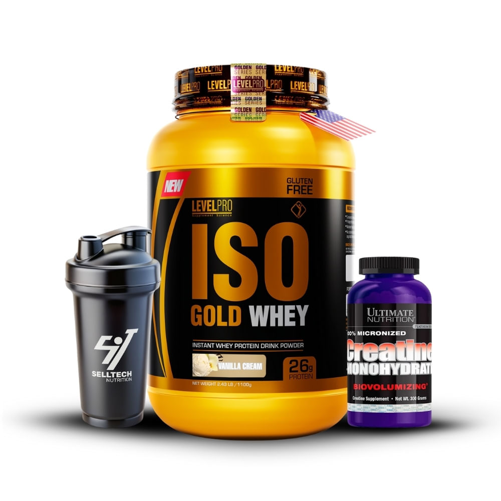 Iso Gold Whey 2.43lbs Vanilla Creme+Creatina Ultimate Nutrition 300gr+Shaker