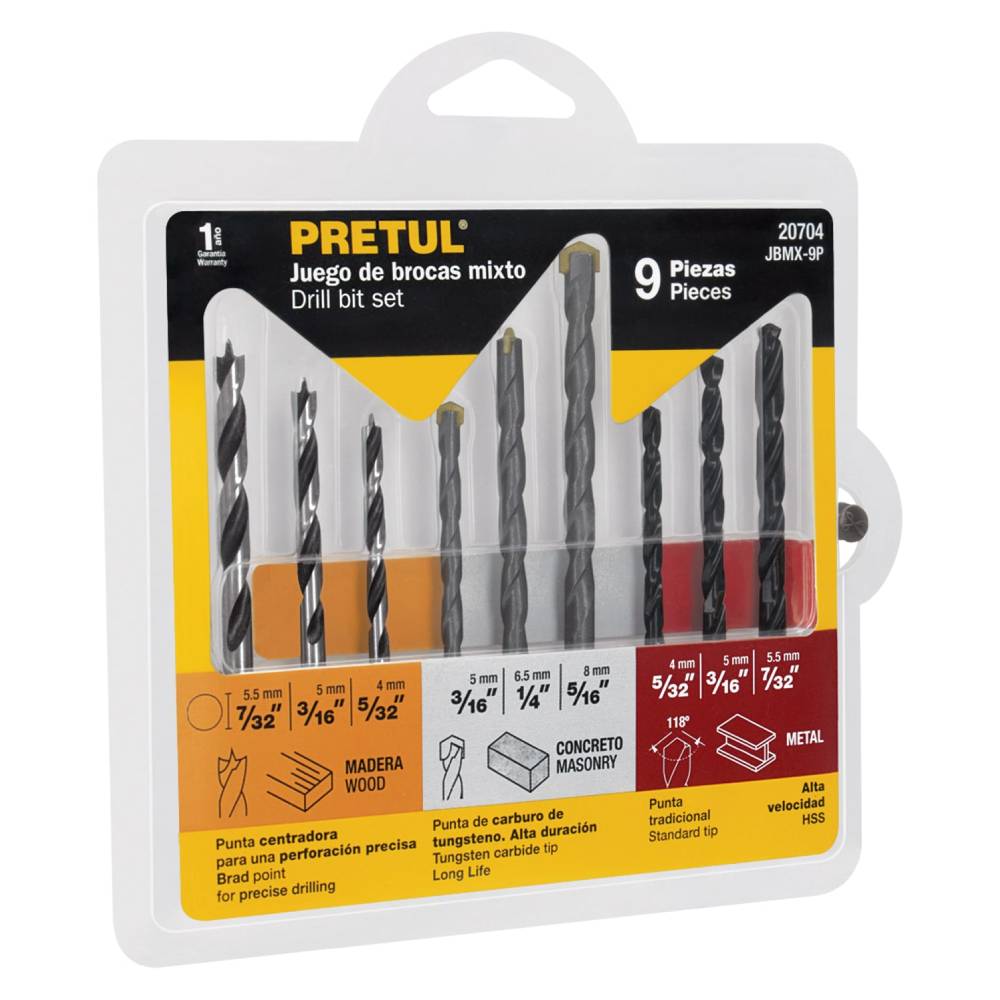 Juego de Brocas para Metal, Concreto y Madera 9 Piezas Pretul 20704