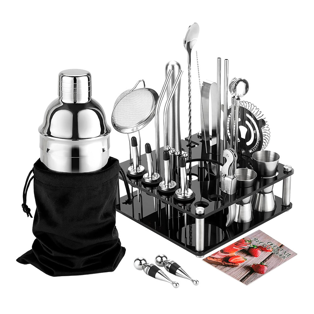 Juego de Coctelero con 26 Piezas de Acero Inoxidable con Soporte Acrílico, Funda y Recetario