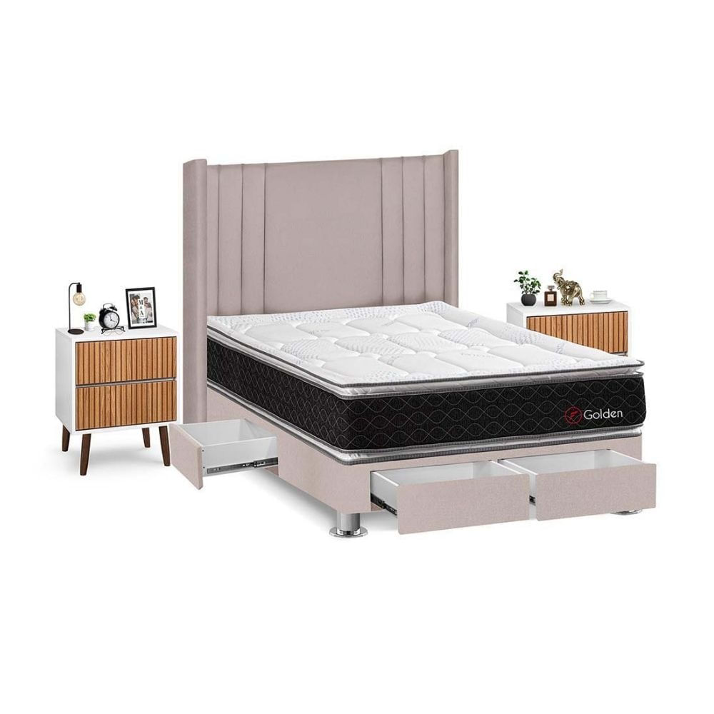 Juego de Dormitorio Forli Golden 4 Cajones 2 Plazas Beige + Velador Milan
