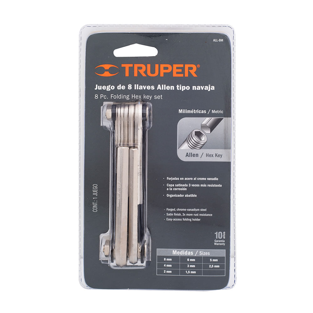 | Características | Set de llaves hexagonales milimétricas, tipo navaja. Forjadas en acero al cromo vanadio. Capa satinada 3 veces mas resistente a la corrosión. Organizador abatible tipo navaja. Organizador conserva las llaves juntas listas para usarse o guardarse. |