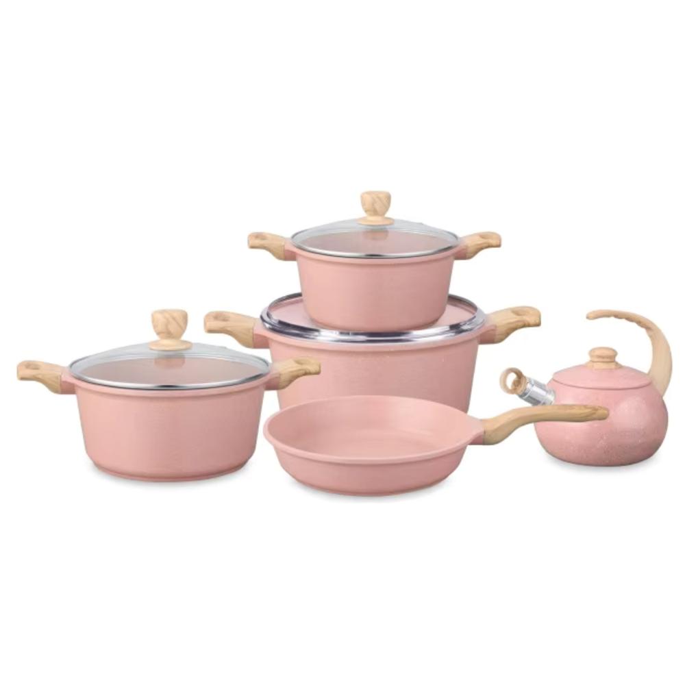 Juego de Olla de Roca Volcánica más Tetera Rosada 9 Piezas