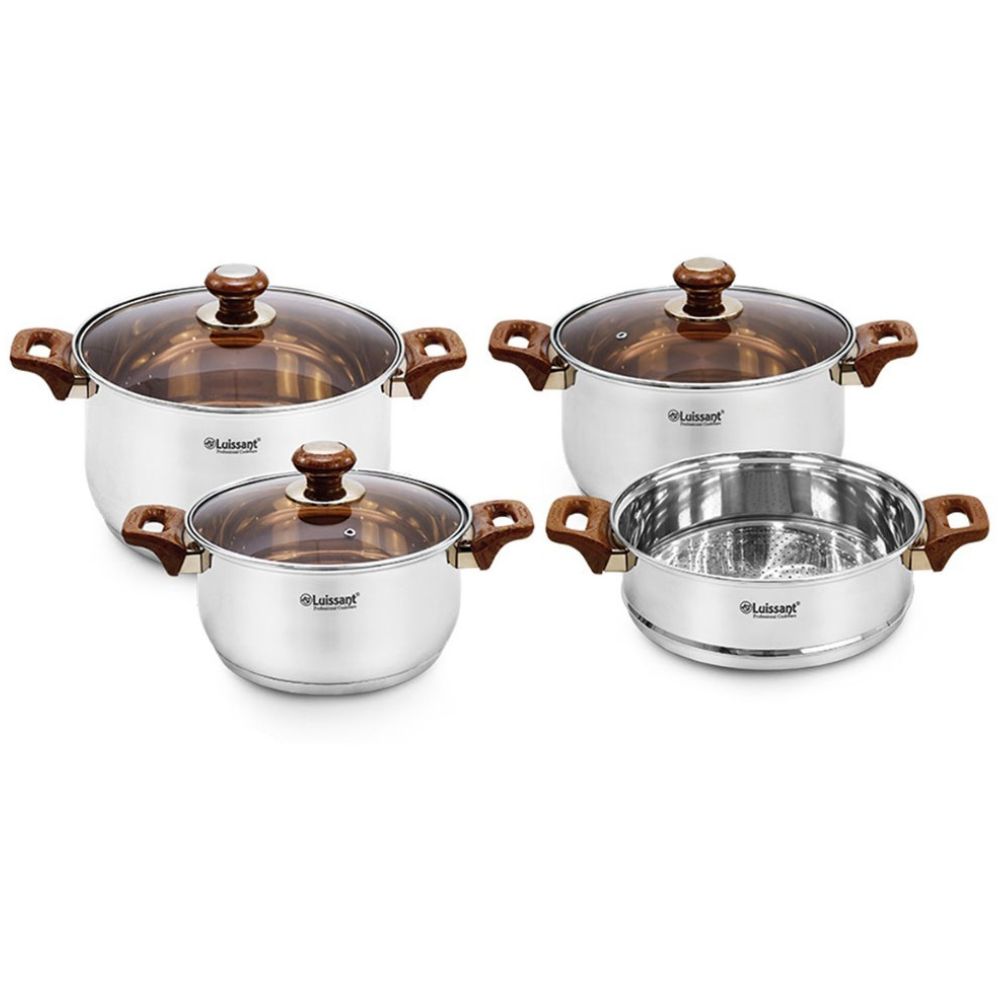 Juego De Ollas Acero Inoxidable LUISSANT 7 Piezas C/Tapa De Vidrio