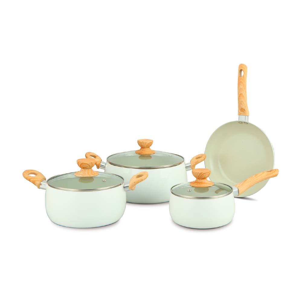 | Características | Producto manufacturado en aluminio con recubrimiento cerámico en color beige al interior y antiadherente en color blanco al exterior. El recubrimiento evita que los alimentos se peguen, facilitando su limpieza. El aluminio distribuye el calor uniformemente, proporcionando una cocción más rápida y ahorro de energía. Asas de bakelita con acabado suave al tacto con efecto madera, aislante de calor, con diseño ergonómico para un manejo cómodo y seguro. Tapa de vidrio templado con borde protector en acero inoxidable, perilla y disco de bakelita con acabado suave al tacto con efecto madera, aislante de calor, orificio para salida de vapor durante la cocción de los alimentos. |