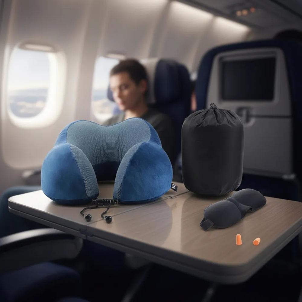 Kit Cojin de Cuello Color Azul Almohada para viaje con espuma viscoelástica y tapaoidos antifaz
