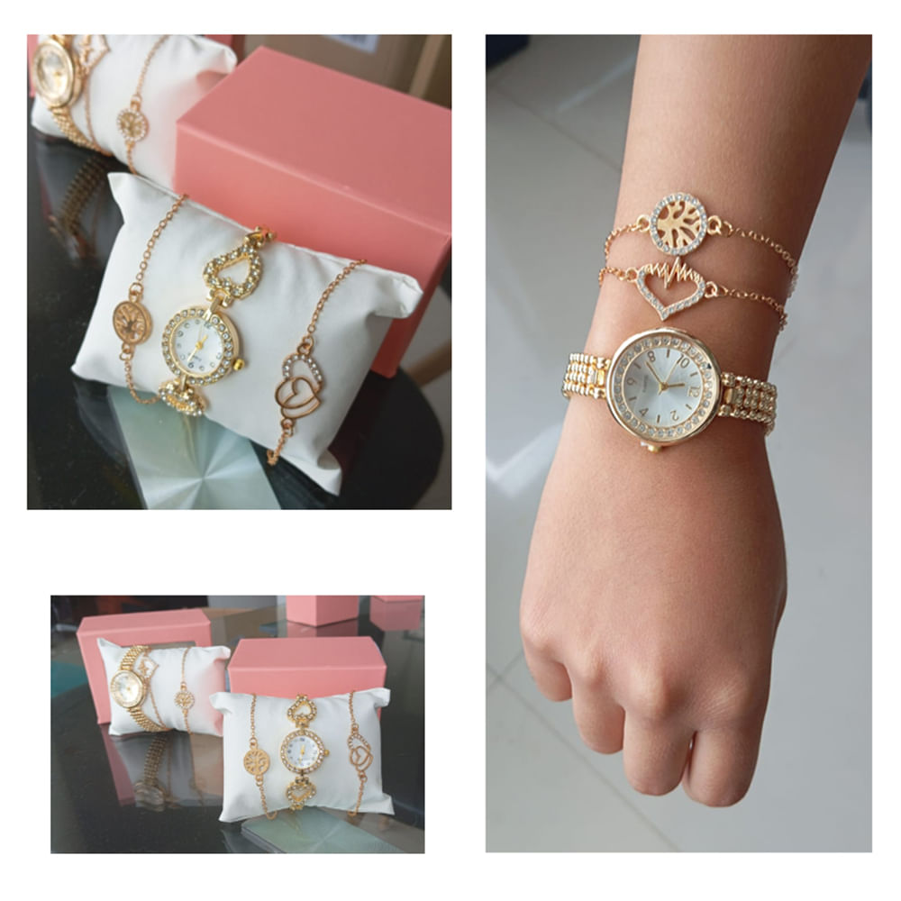 Kit Reloj Dorado + 2 Pulseras para Mujer Dama Regalo Día de Madre