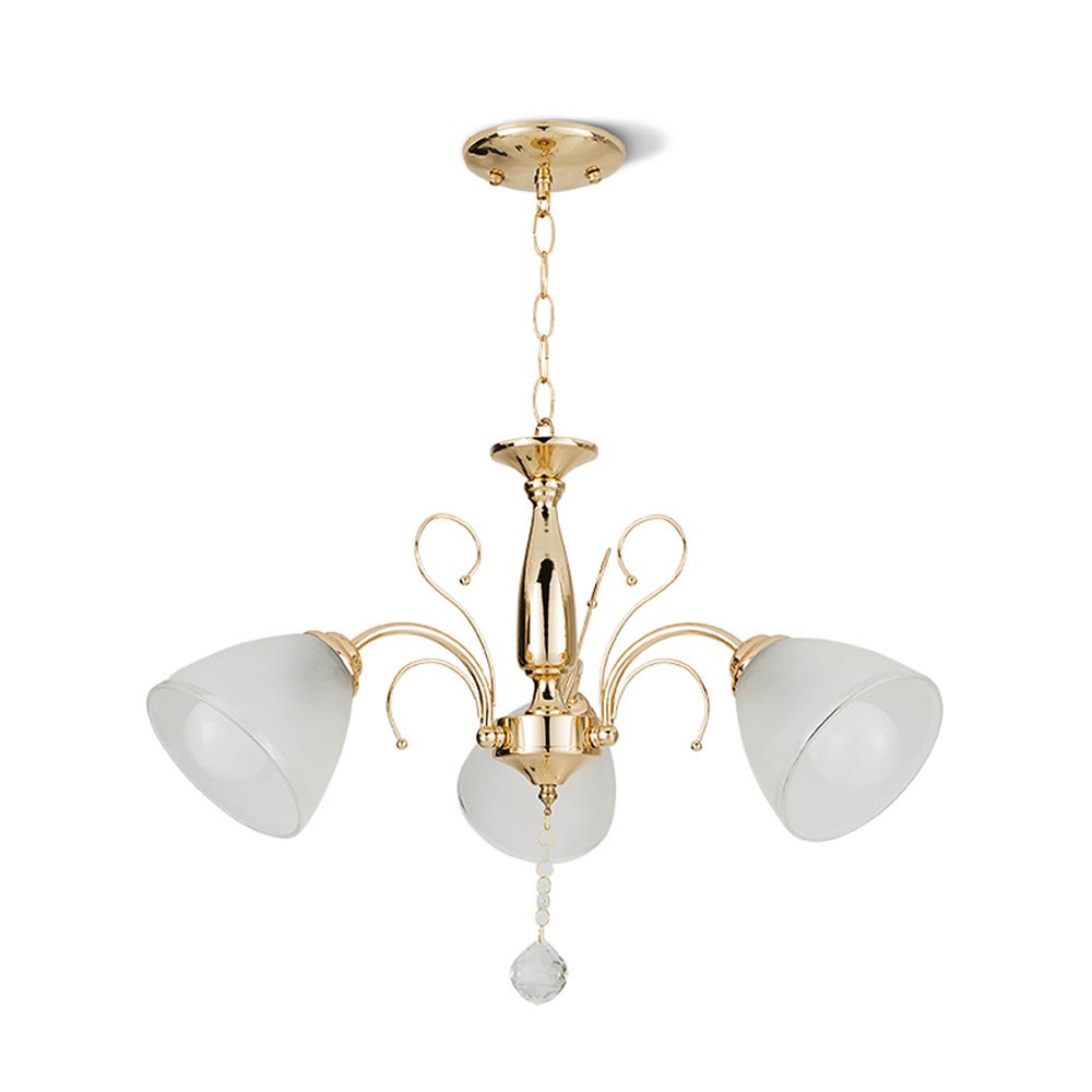| Características | Lampara congante metálico con acabado dorado, diseño decorativo para interiores como sala, comedor y dormitorio, cuenta con copas de vidrio y 3 soquet tipo E27 para la instalación del foco, además tiene cable y cadena regulable para la altura de instalación. |