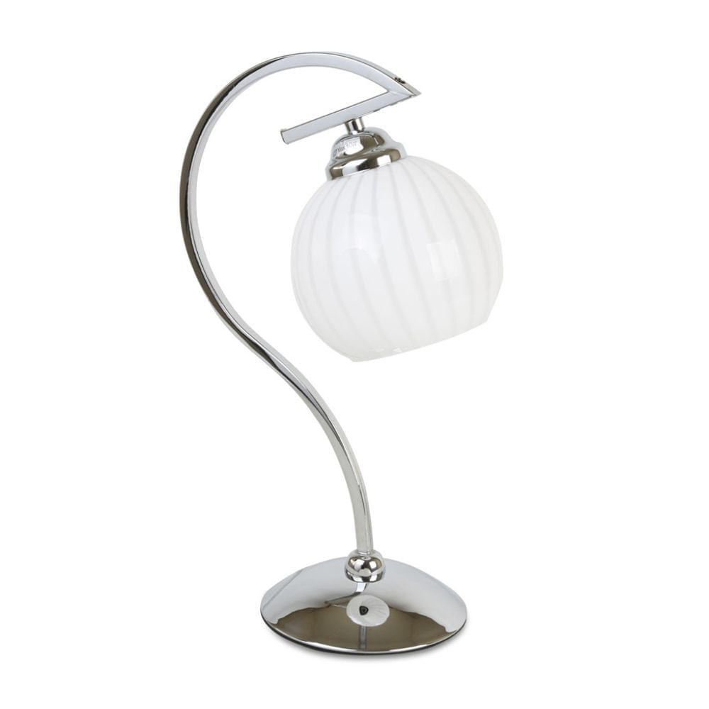 | Características | Lámpara de mesa con base metálica en acabado cromado, diseño decorativo y vidrio en forma de copa, cuenta con rosca E27 para colocar el foco, además tiene cable y enchufe incorporado para la conexión. |