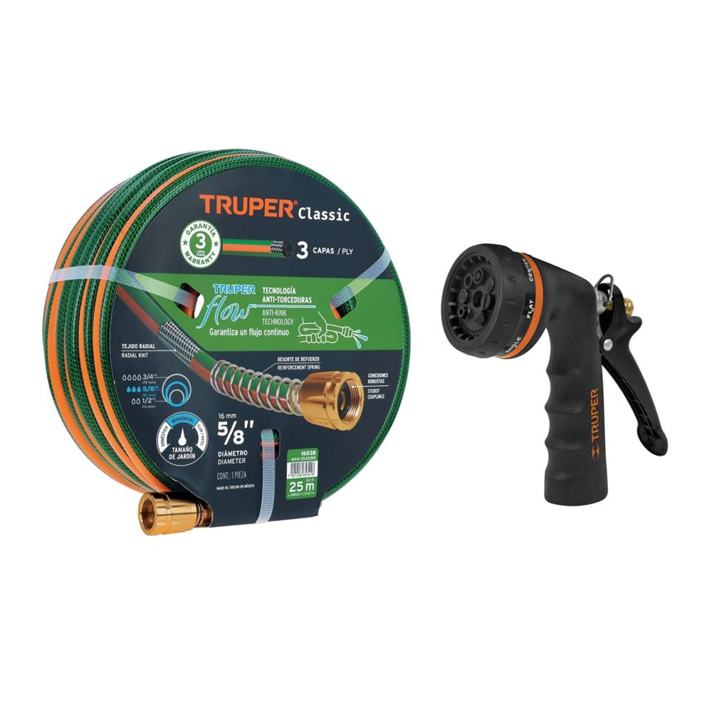 Manguera 5/8" Reforzada 25 Metros Conexión de Metal + Pistola de Riego Metalica Truper